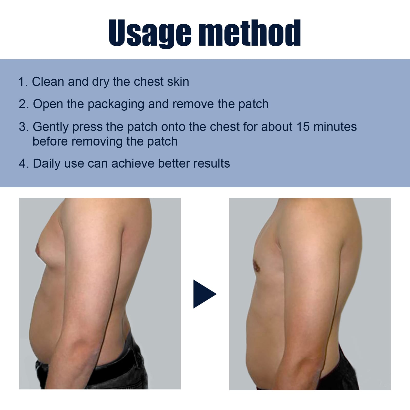 Our breast firming patch for men contains Yohimbe bark extract, ginger extract. It can promote the breakdown of stored fat, promote fat oxidation to help reduce fat and control fat levels in the body. Its use is simple: 1. Clean and dry the chest skin, 2. Open the package, remove the patch, 3. After gently pressing the patch on the chest for about 15 minutes, remove the patch. 4. Daily use can achieve better results. It also provides a safe and comfortable non-surgical way to reduce the size of men’s breasts.